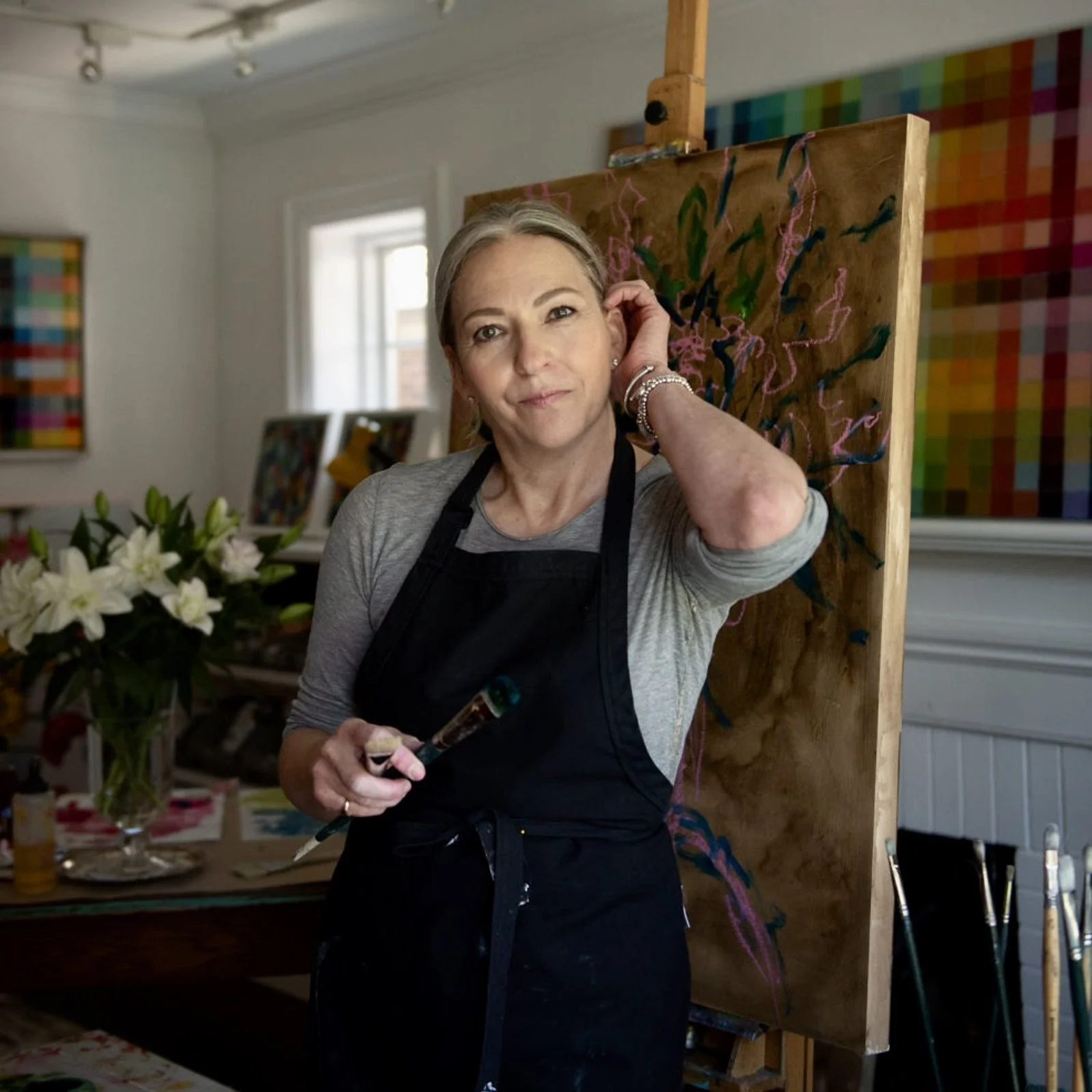 Flowers remain a recurring source of inspiration. Their unfolding forms hold a sense of movement, resilience, and quiet joy. Colour itself is equally central. In some series, pigments are blended systematically into gridded or pixelated structures that examine the relationships between hues. In others, colour is applied more freely through expressive brushwork and unexpected combinations.